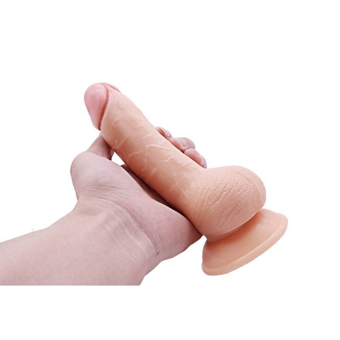 Pênis realístico com ventosa, possui escroto pequeno, veias e glande.