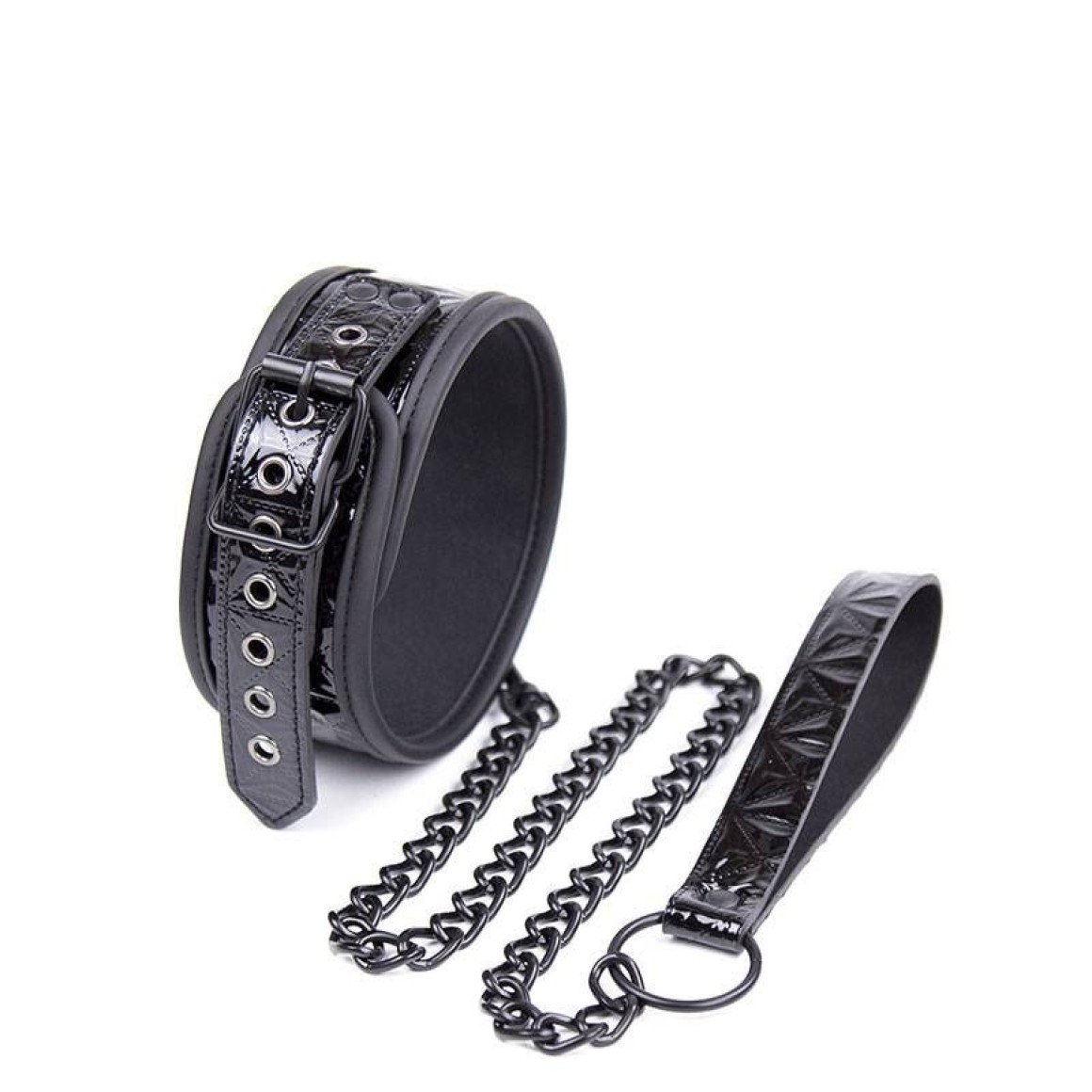 Coleira com acabamento brilhante em alto relevo, forro interno e guia com corrente de metal e alça.