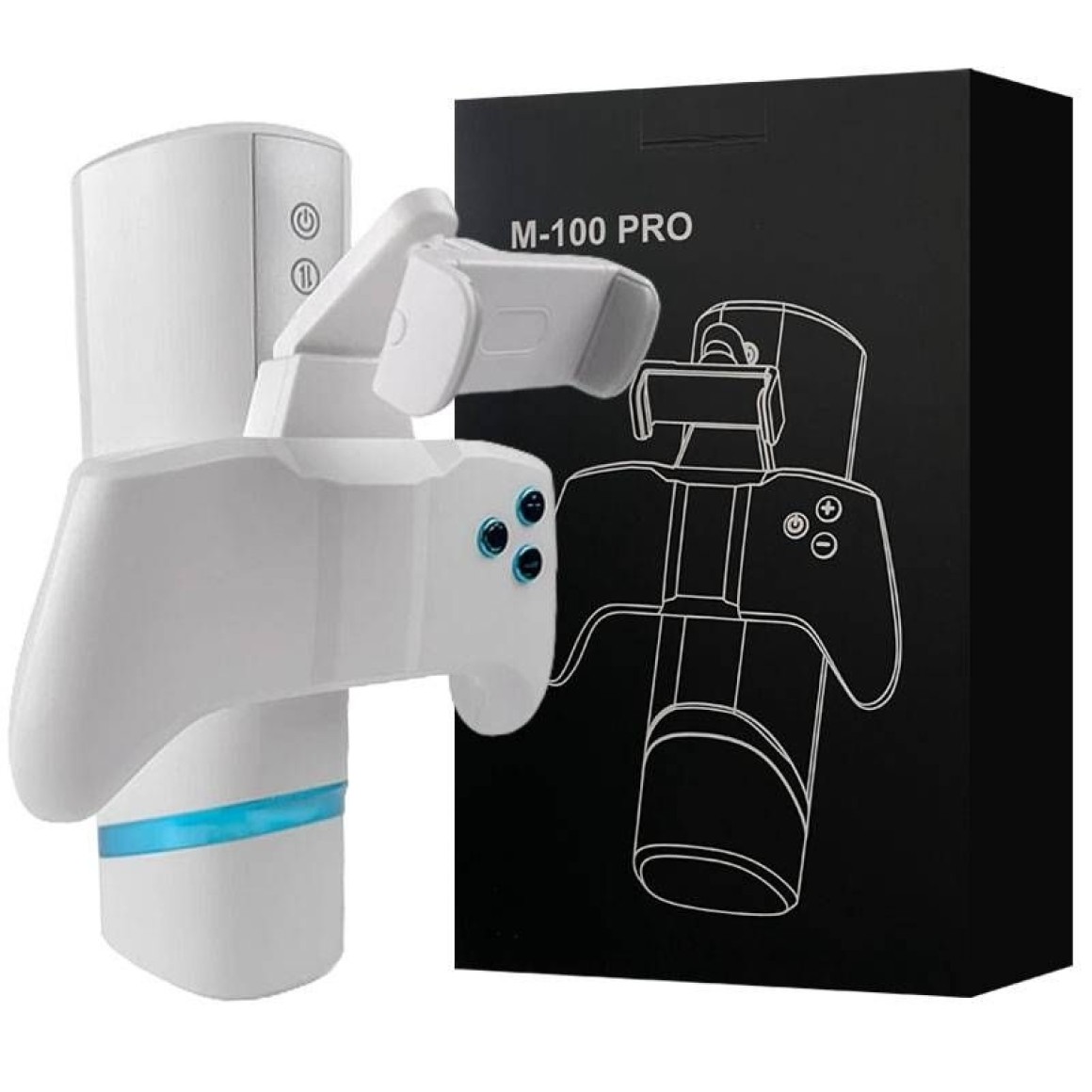 Masturbador recarregável com movimentos vai e vem, suporte para celular e controle de funções formato joystick.