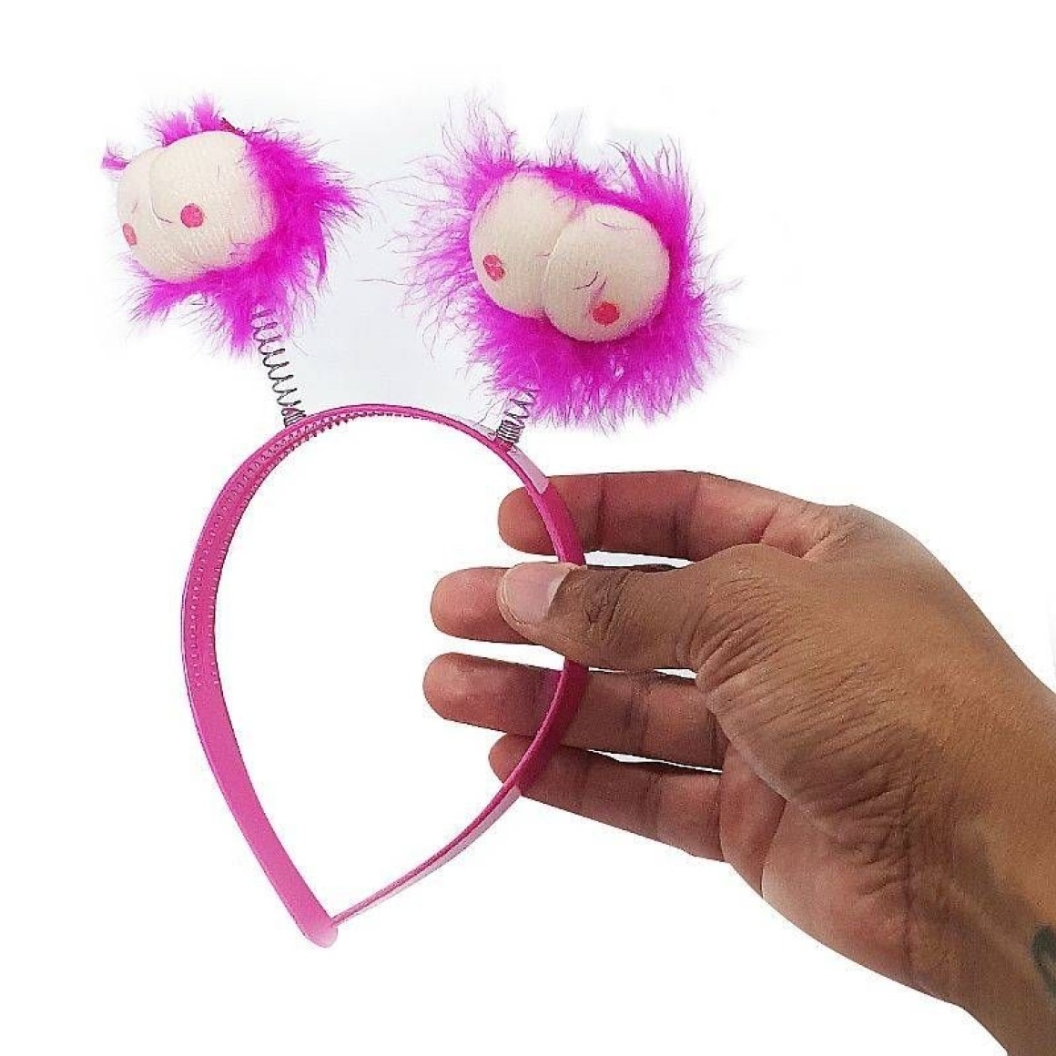 Tiara para cabeça com acessório de peitos de pelúcia e plumas. Perfeito para levar nas festas e brincar com seus amigos!