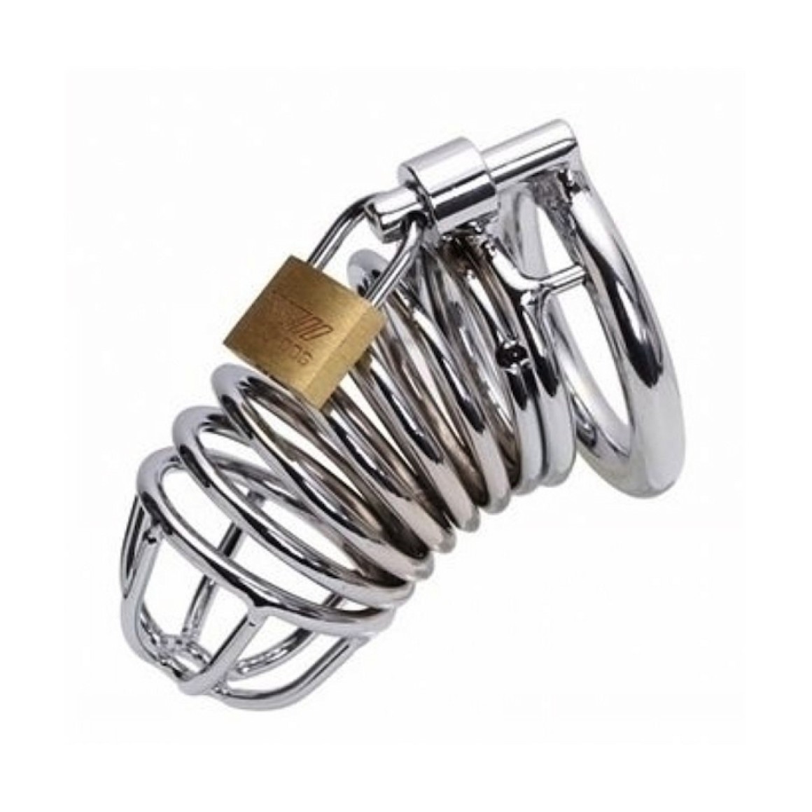 Cinto de castidade masculino em aço com 1 argola para escroto, e o restante é totalmente vazado.
