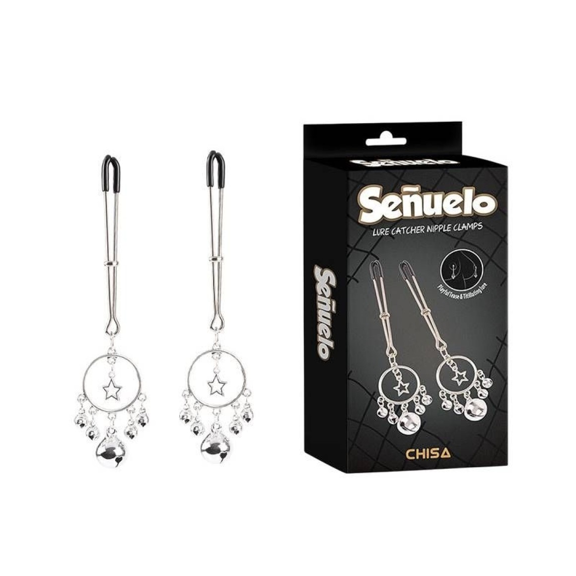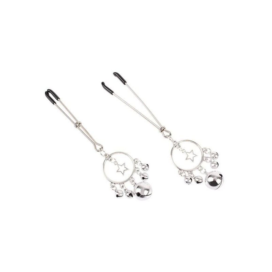 Grampos para mamilos estilo pinça com guizo, possui anel deslizante para ajuste de pressão.