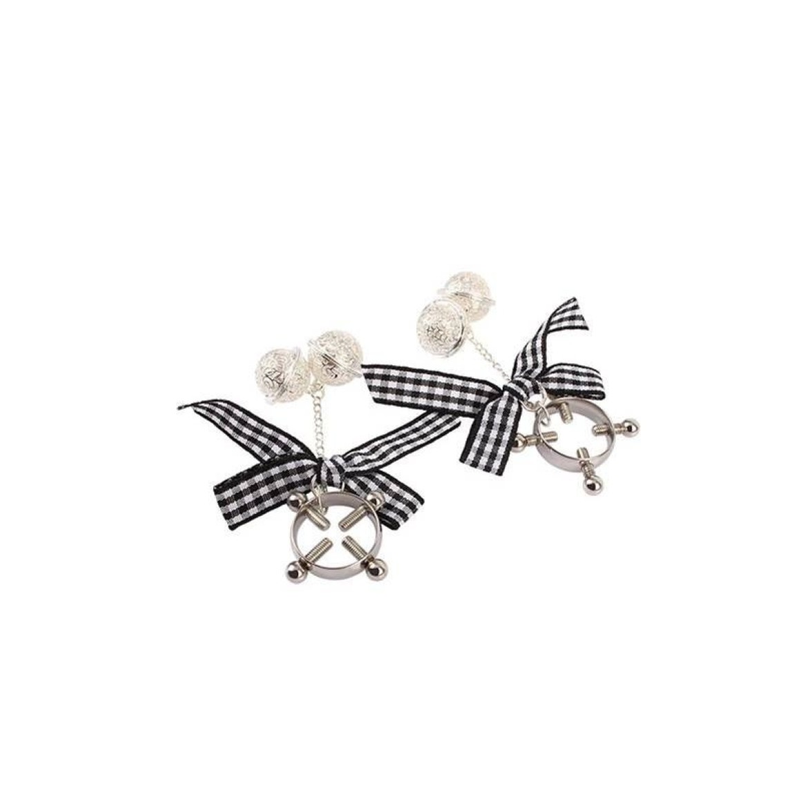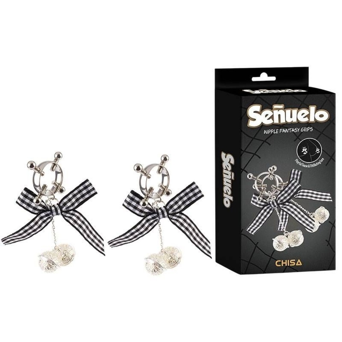 Estimulador para mamilos com guizo duplo e fita quadriculada como ornamento. Possui ajuste de pressão atráves de 4 parafusos.