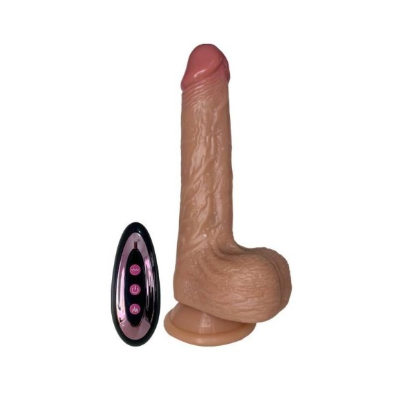 Prótese realística recarregável com movimentos dançantes, possui glande, veias, escroto e ventosa.