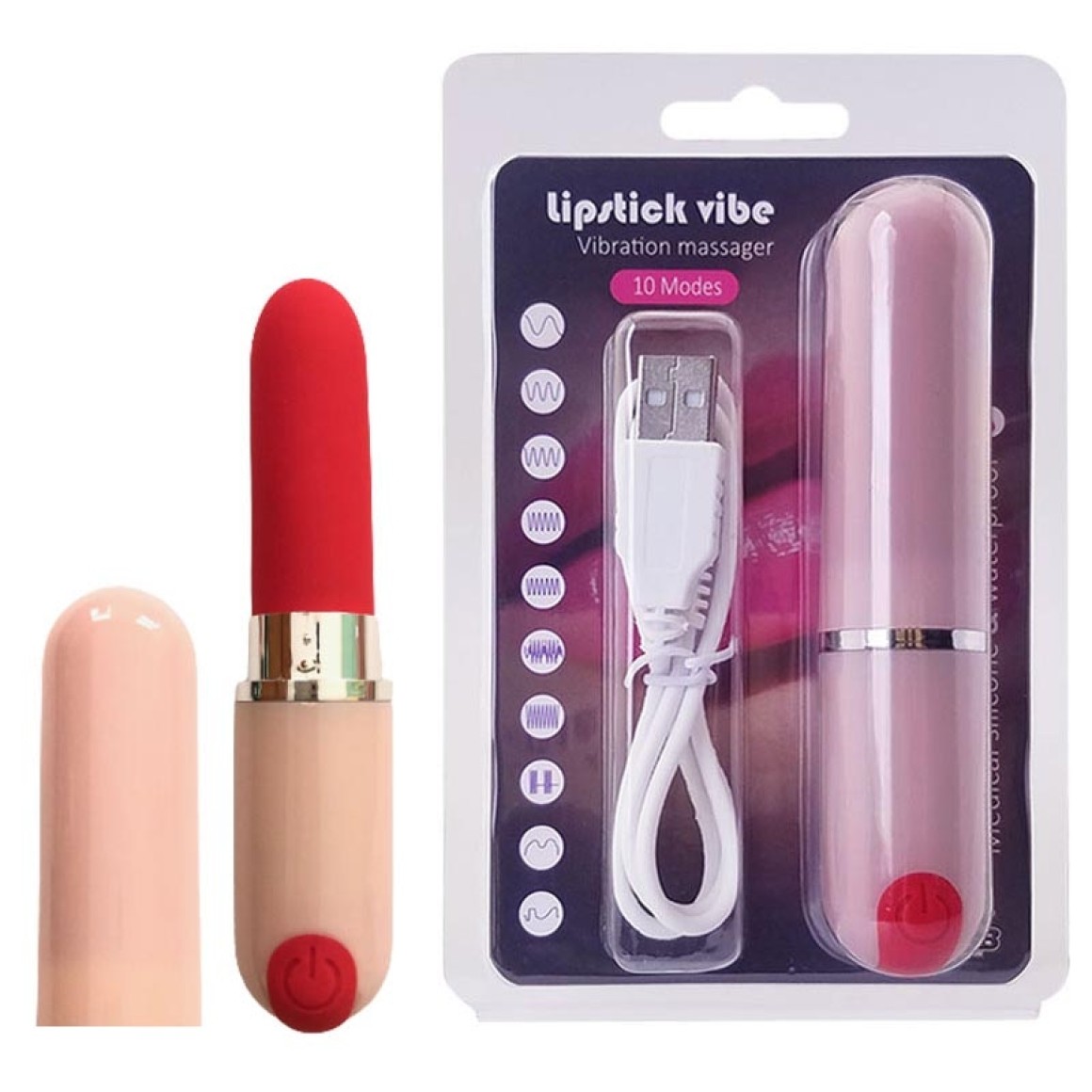 Vibrador recarregável formato batom, possui 10 modos de vibração.