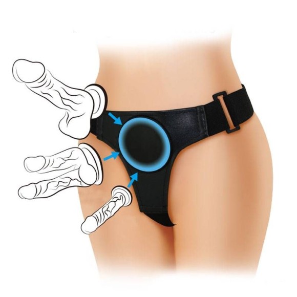 Cinta peniana com base para utilizar penetradores que possuam ventosa em sua base com até 9 cm de diâmetro.