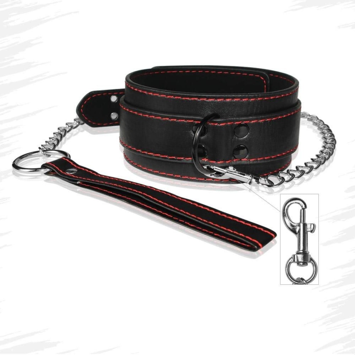 Coleira bondage com guia em corrente ajustável por meio de fivelas metálicas, confeccionada em couro sintético e vinil, com parte interna macia e confortável.