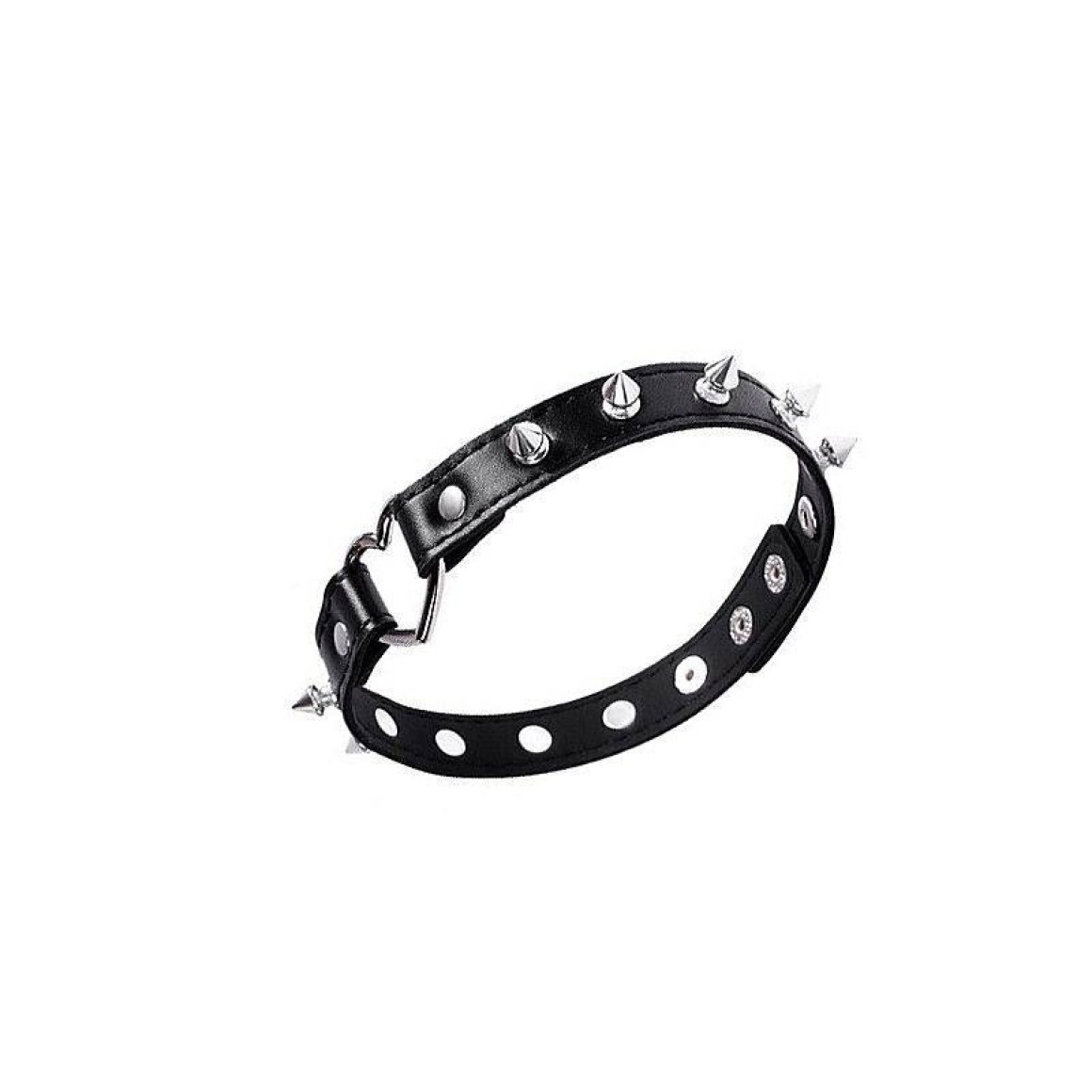Coleira bondage ajustável por meio de fivelas metálicas, confeccionada em couro sintético.