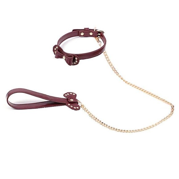 Coleira bondage com guia em corrente ajustável por meio de fivelas metálicas, confeccionada em couro sintético, com parte interna confortável.
