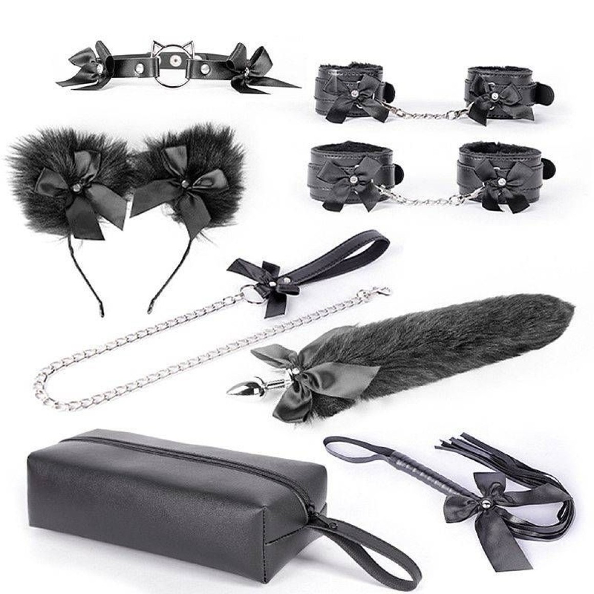 kit Sado com Estojo - Algema, Tornozeleira com Corrente, Chicote / Rabo de Raposa