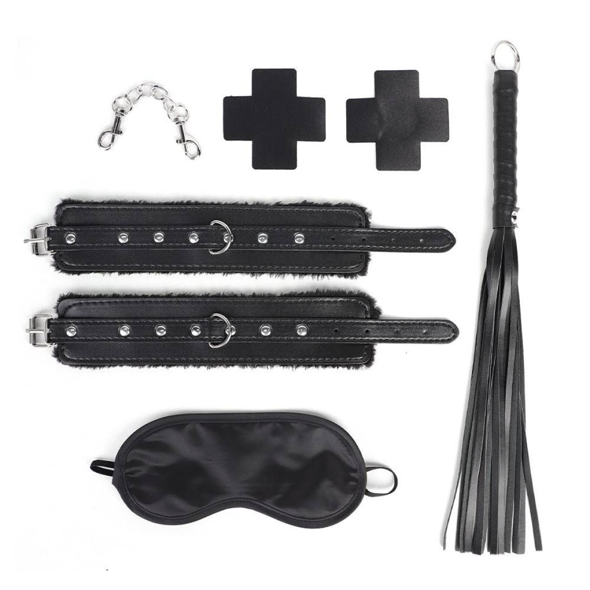 Este kit sado é composto por 4 produtos essenciais, incluindo venda, chicote, algema, adesivos sensoriais em cruz para seios.
