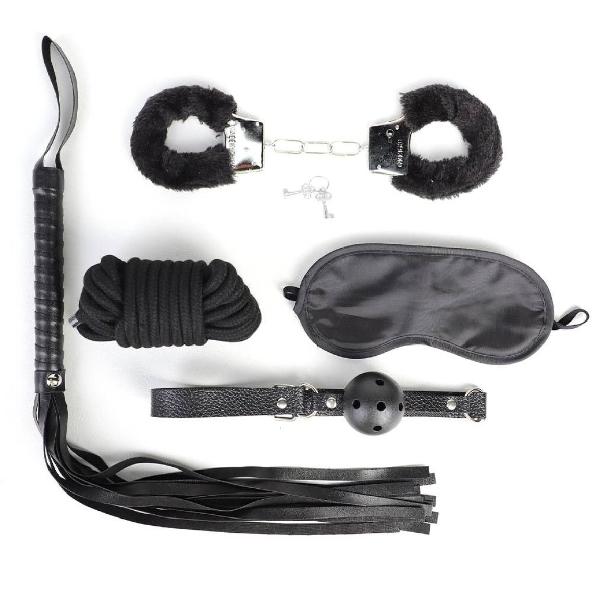 Este kit sado é composto por 5 produtos essenciais, incluindo venda, chicote, algema,mordaça,corda.