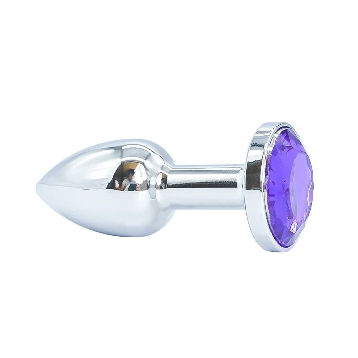 Plug anal de luxo em metal, com formato cônico, feito em alumínio fundido e polido a mão, possui em sua base uma pedra lapidada que lembra um diamante colorido.