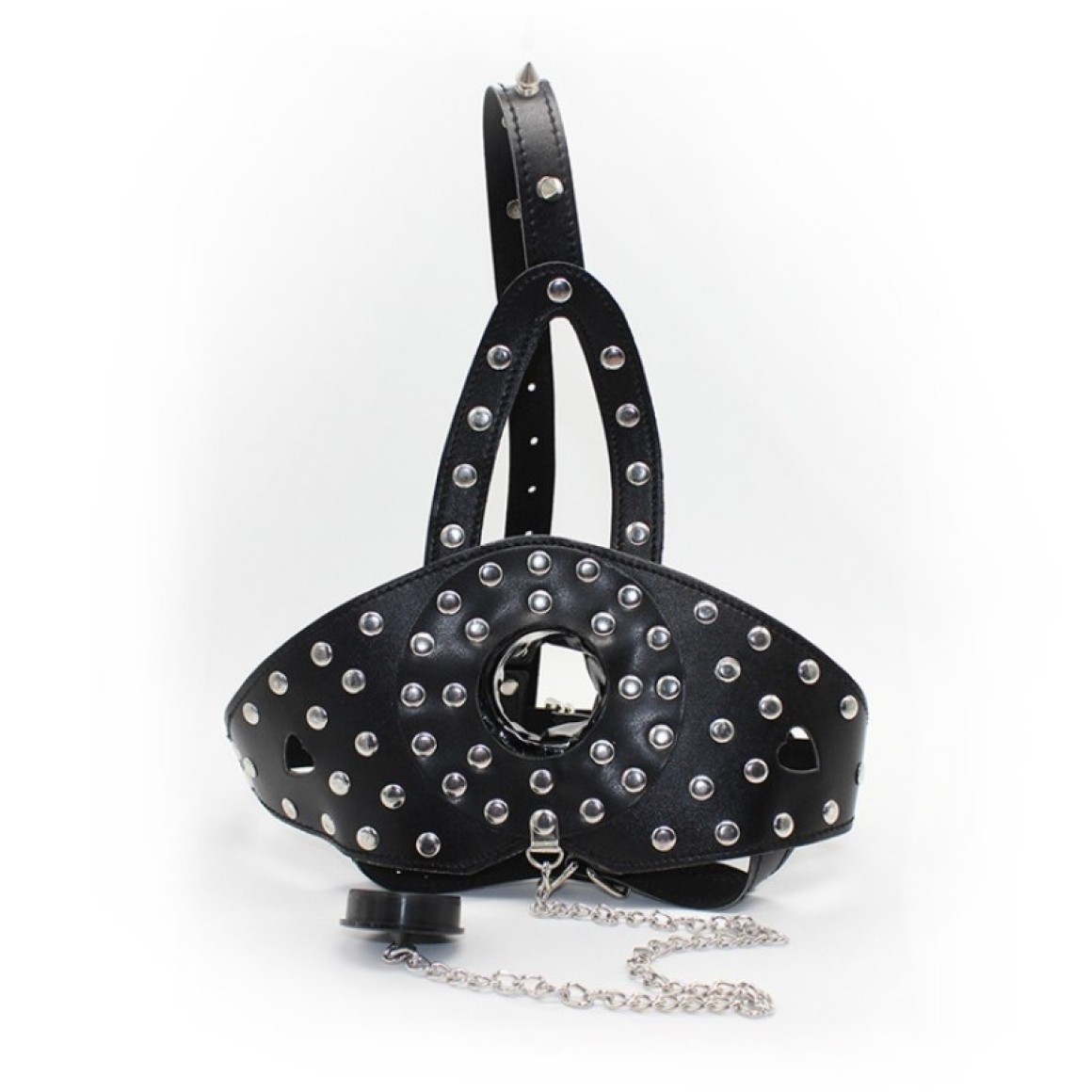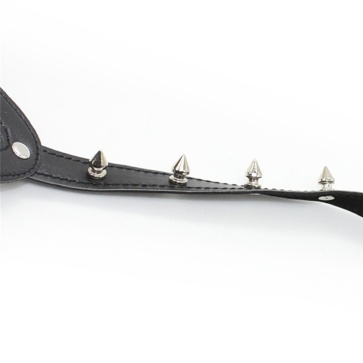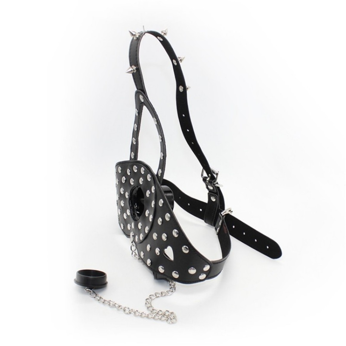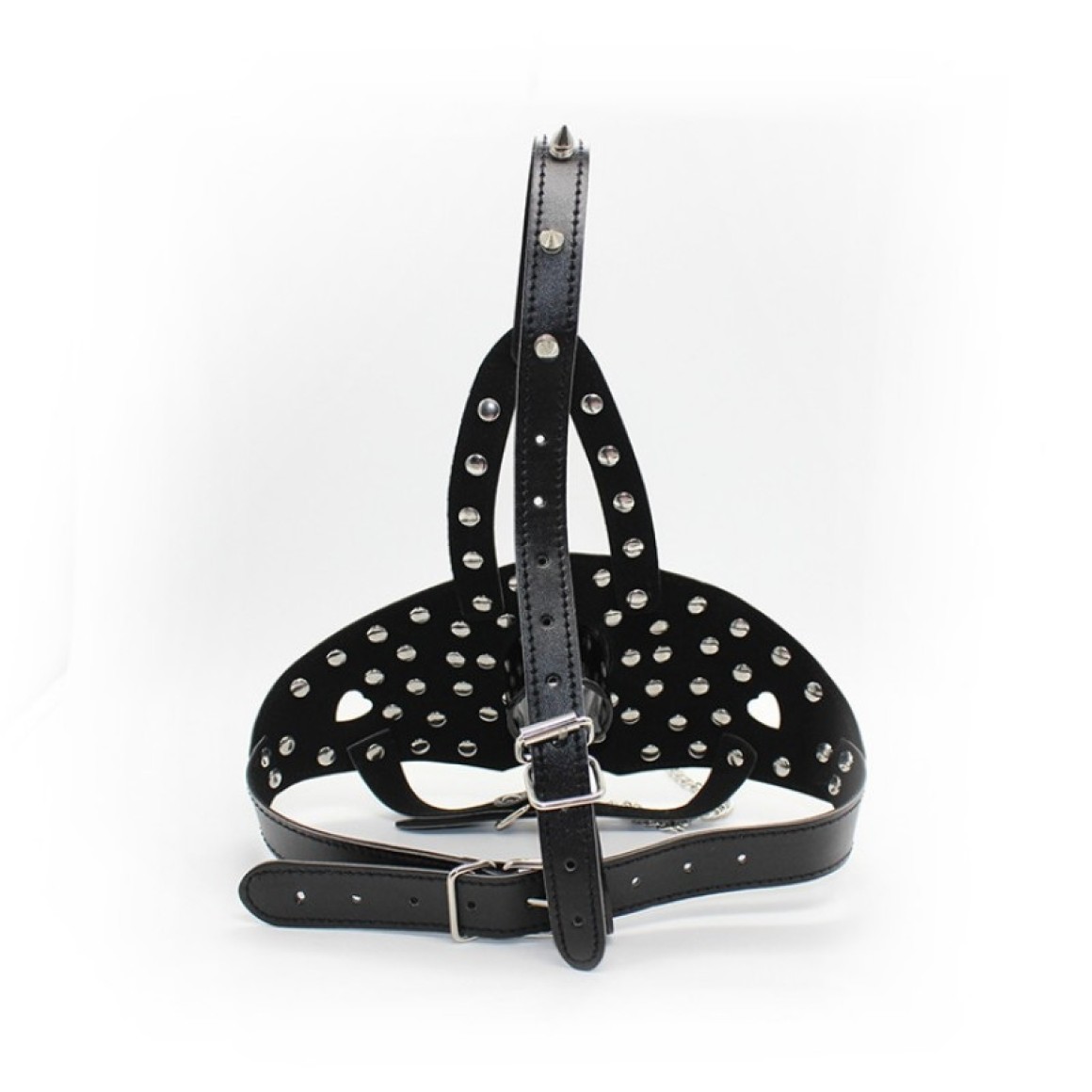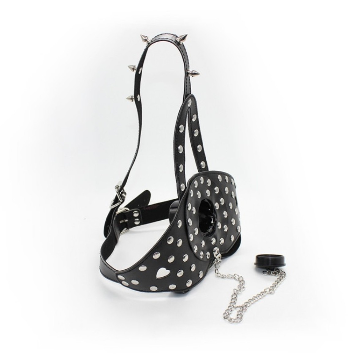 Focinheira em couro sintético com fivelas ajustáveis e espinhos em metal.