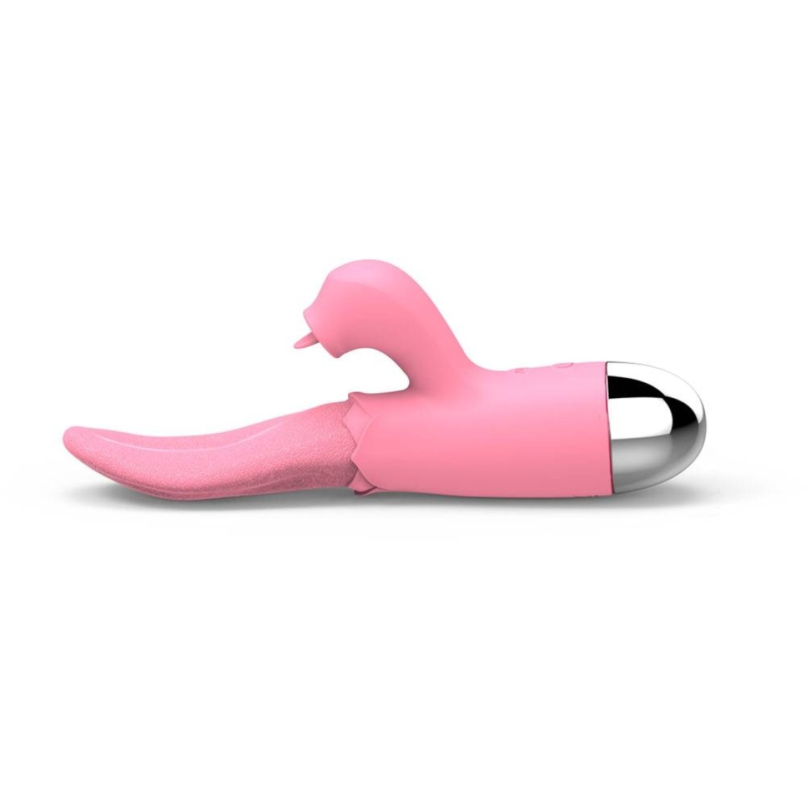 Vibrador projetado para proporcionar dupla estimulação, com massagem no clitóris e penetração vaginal simultaneamente. Seu design apresenta uma glande ligeiramente curva, flexível e saliente, reproduzindo a forma de uma lígua humano.