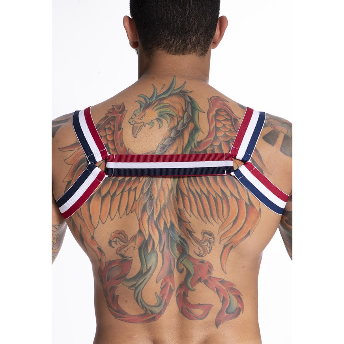 HARNESS EM ELÁSTICO TRICOLOR LISTRADO.