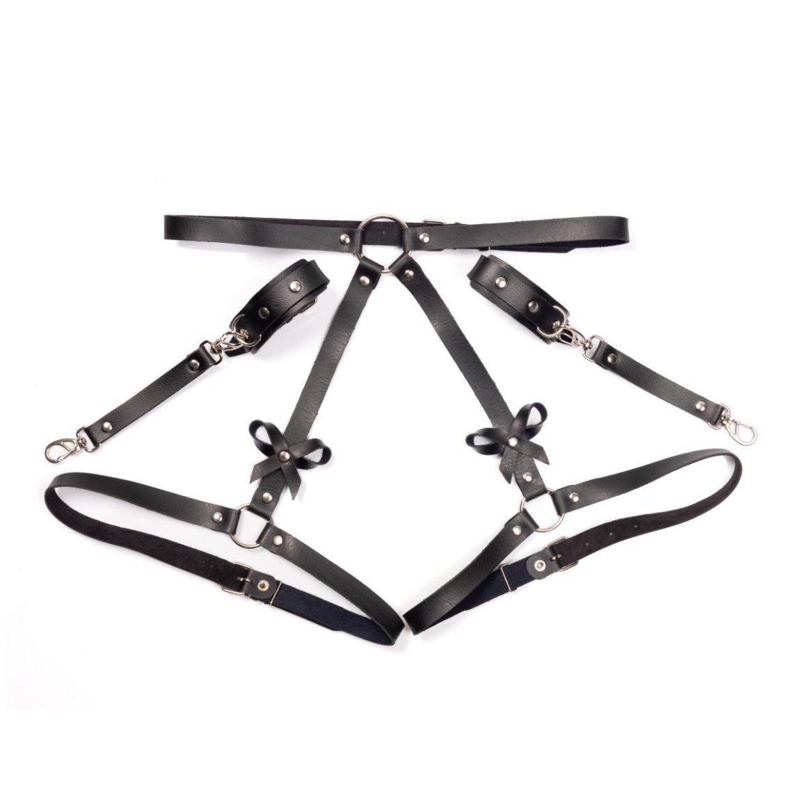 O Harness Lacinho é um tipo de arreio semelhante à uma cinta liga que envolve as coxas, o bumbum e a cintura, com tiras ajustáveis de acordo com sua necessidade e medida. Este modelo acompanha duas algemas reguláveis que podem ser usadas juntas ou separadas do Harness, ressaltando sua versatilidade.