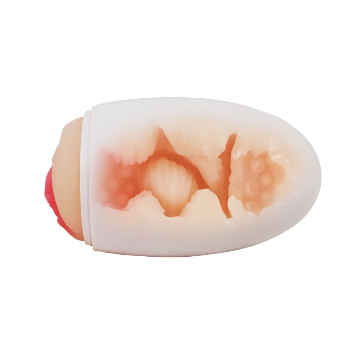 Dentro da embalagem em forma de casca, você encontra uma peça de silicone que imita um ovo, porém oca e com um orifício na base.