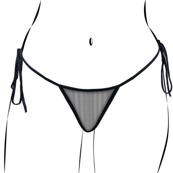 Calcinha em tule de malha, acabamento em viés e regulagem de amarração lateral.
