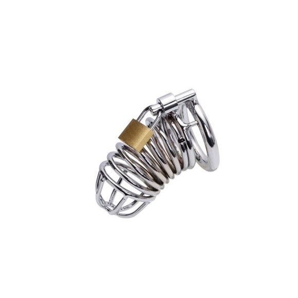 Cinto de castidade masculino vazado com anel para o escroto e cadeado.