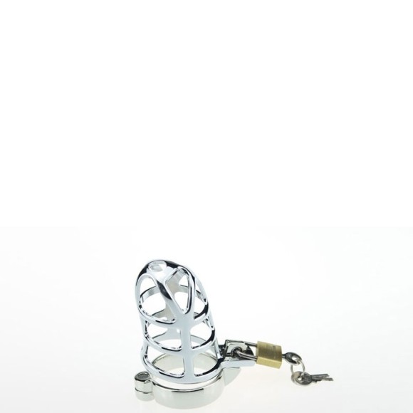 Cinto de castidade masculino vazado com anel para o escroto e cadeado.