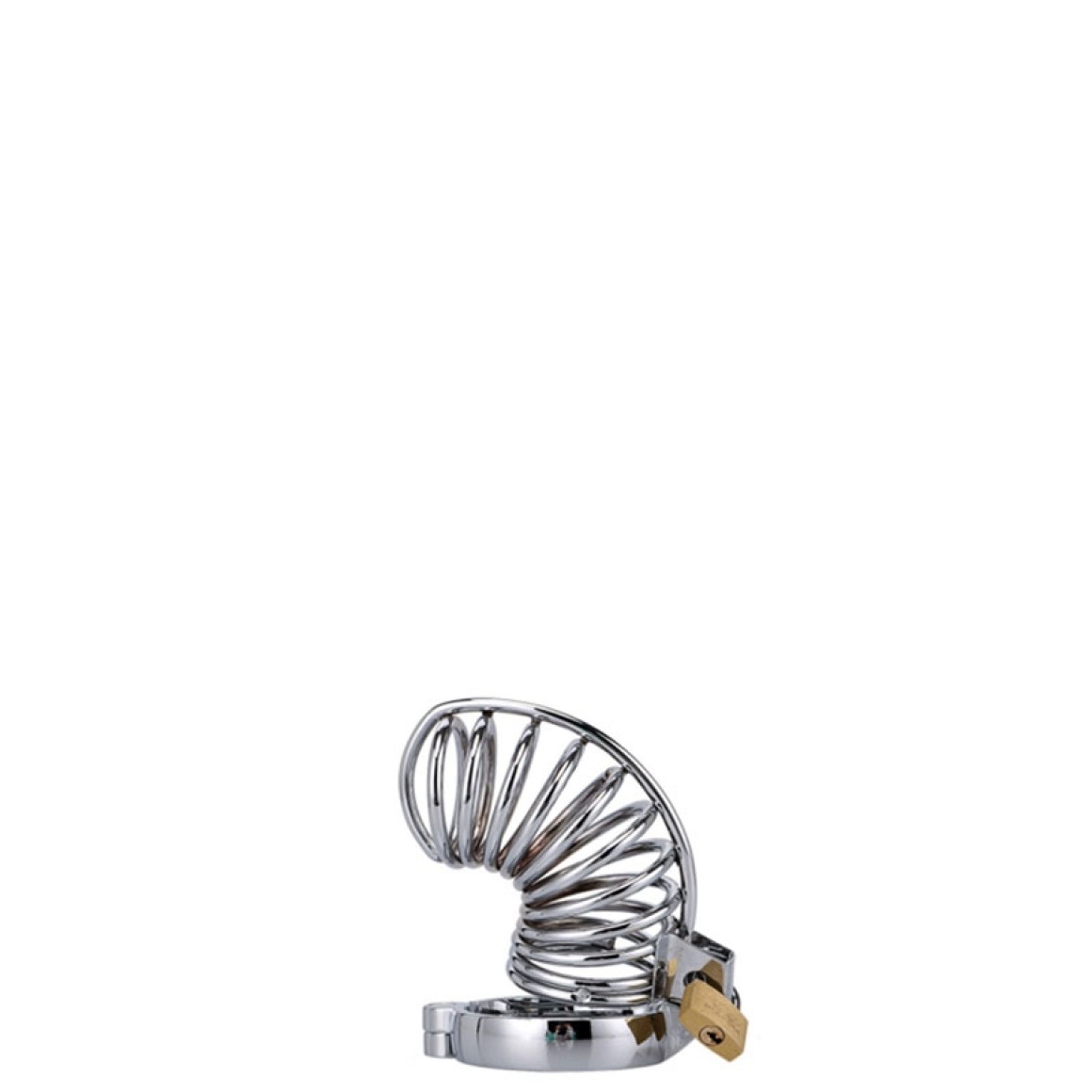 Cinto de castidade masculino vazado com anel para o escroto e cadeado.
