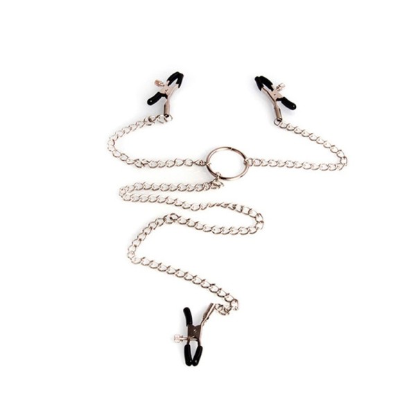 Grampos para mamilos e clitóris com presilhas ajustáveis, possui corrente que interliga os grampos.