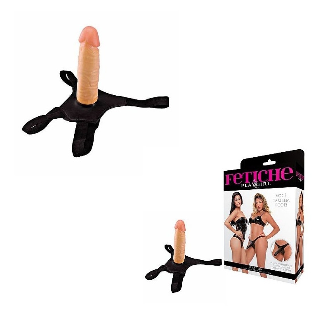 Cinta em courvin e tiras elásticas com pênis realístico em PVC atóxico. 16 cm de comprimento e 4 cm de diâmetro.