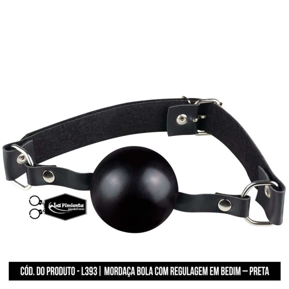 Mordaça em formato de bola feita com material emborrachado e flexível, confeccionada artesanalmente com alça em sintético semelhante à couro que garante beleza e resistência.
