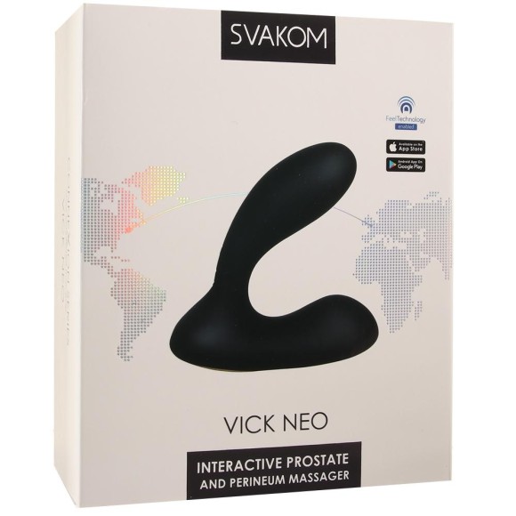 Vick Neo da Svakom é um vibrador unissex estimulador de próstata ou de Ponto G e clitóris interativo com app, feito de silicone macio com toque aveludado. Conta com 7 modos de vibração e 5 níveis de intensidade, é à prova d'água e recarregável via USB. Vick Neo foi desenvolvimento cuidadosamente para se adaptar perfeitamente a anatomia de seu corpo, com um ângulo que permite estimular a próstata e o períneo para os homens ou Ponto G e clitóris para mulheres, além de ser construído com mais sofisticada tecnologia envolvida em material impermeável, que permite que ele lhe acompanhe no chuveiro, piscina ou banheira. A tecnologia e o design mais uma vez nos surpreendem que estar fisicamente separados nada impede o amor e o prazer, e juntos, vocês irão quebrar essa barreira. Possui homologação e certificado americano, possibilitando uma comunicação mundial entre aplicativos e sites pornôs para uma experiência inovadora. Vick Neo faz parte da série Connexion da SVAKOM, uma coleção de 5 aparelhos controlados por aplicativos que prometem a você uma experiência interativa imbatível.