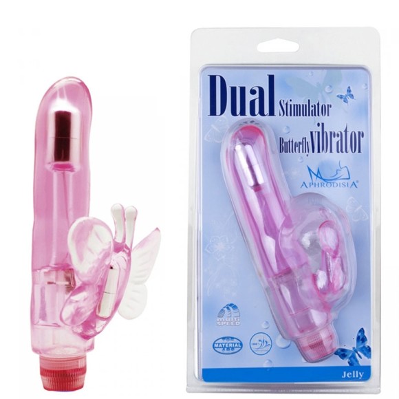 Vibrador com estimulador clitoriano borboleta, feito em jelly macio, com estimulador lateral em formato de borboleta, possui dois motores que funcionam ao mesmo tempo com vibração multivelocidade.