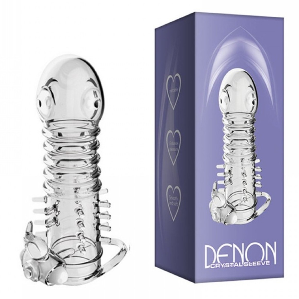 Capa peniana com estimulador clitoriano vibratório e 3,4 cm de extensão em sua ponta.