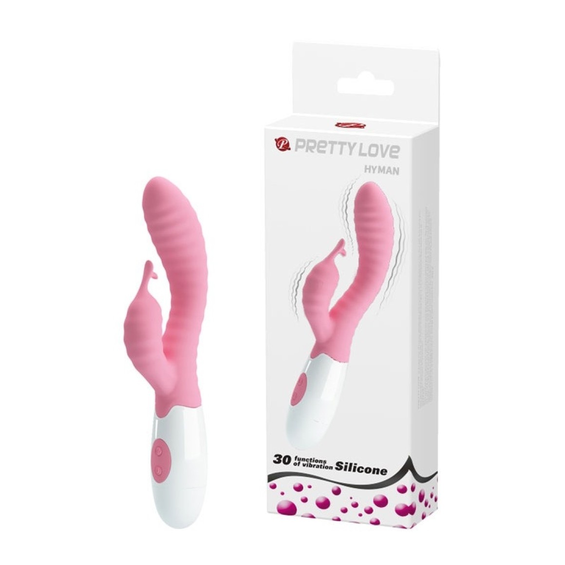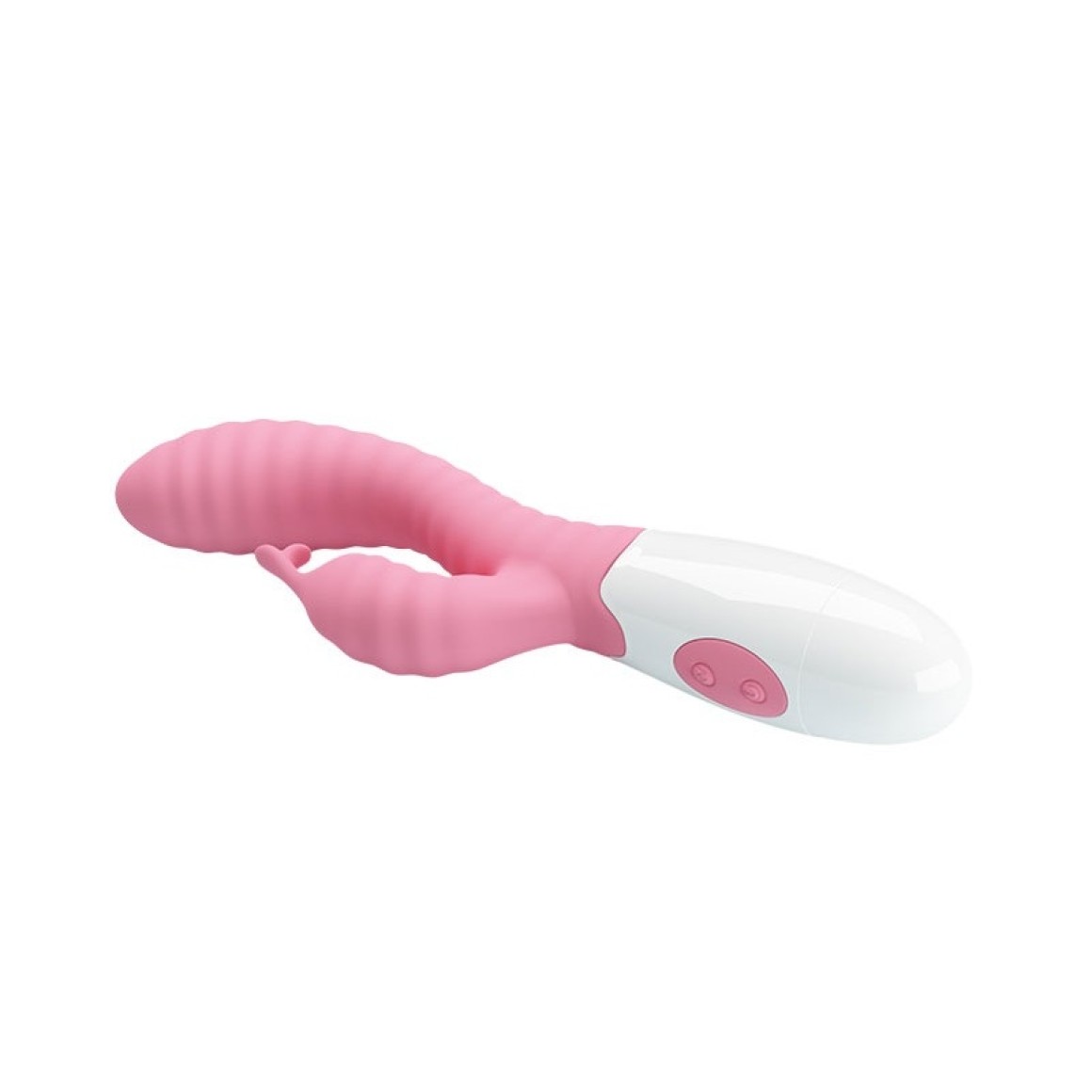 Vibrador ponto G com relevo escalonado e estimulador clitoriano. Possui 30 modos de vibração. Peso: 0,120g
