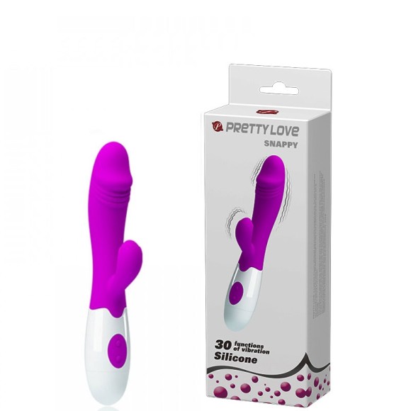 Vibrador com detalhe de glande em sua ponta, estimulador clitoriano em formato de botão de flor. Possui 30 modos de vibração.