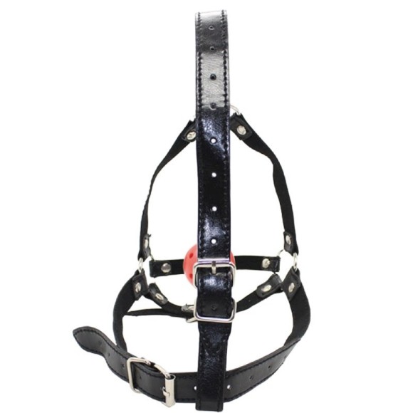 Mordaça com bola, argolas em metal e testeira regulável.