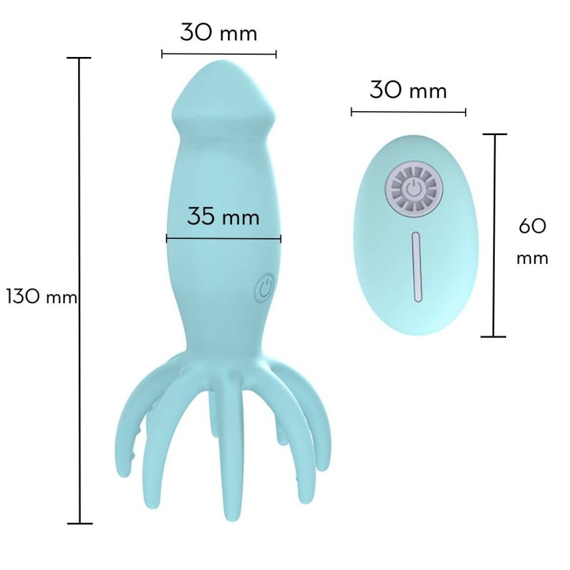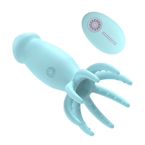 Vibrador em formato de polvo com estimulador do ponto G em formato de glande e tentáculos para estimulação. Possui toque suave e controle remoto sem fio.
