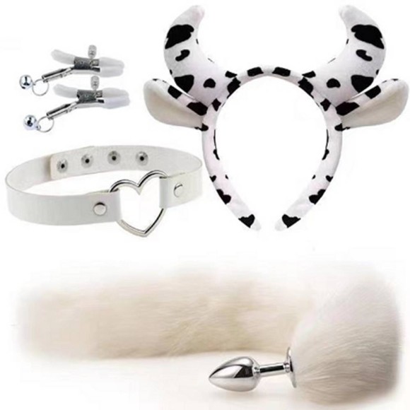 Kit fox composto por 1 tiara de pelúcia em design de vaquinha + 1 plug anal com cauda de pelúcia + 1 par de grampos para seios em metal com presilhas ajustáveis com guizo na ponta + coleira com coração vazado.