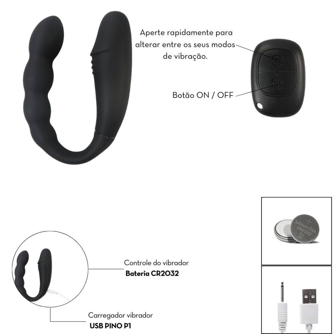 Massageador de próstata duplo com plug anal escalonado e um plug anal em formato glande. Possui toque suave e aveludado.Bateria: Vibrador – Recarregável USB (cabo incluso) / Controle – Utiliza 01 bateria CR2032 (inclusa)