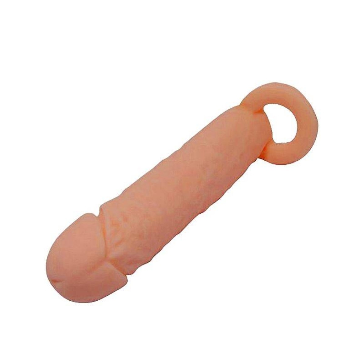 Com aparência bem próxima de um pênis real, esta capa tem a ponta com formato de glande, ela possui tambem um anel para escotro e texturas de veias para maior estímulo durante a penetração.