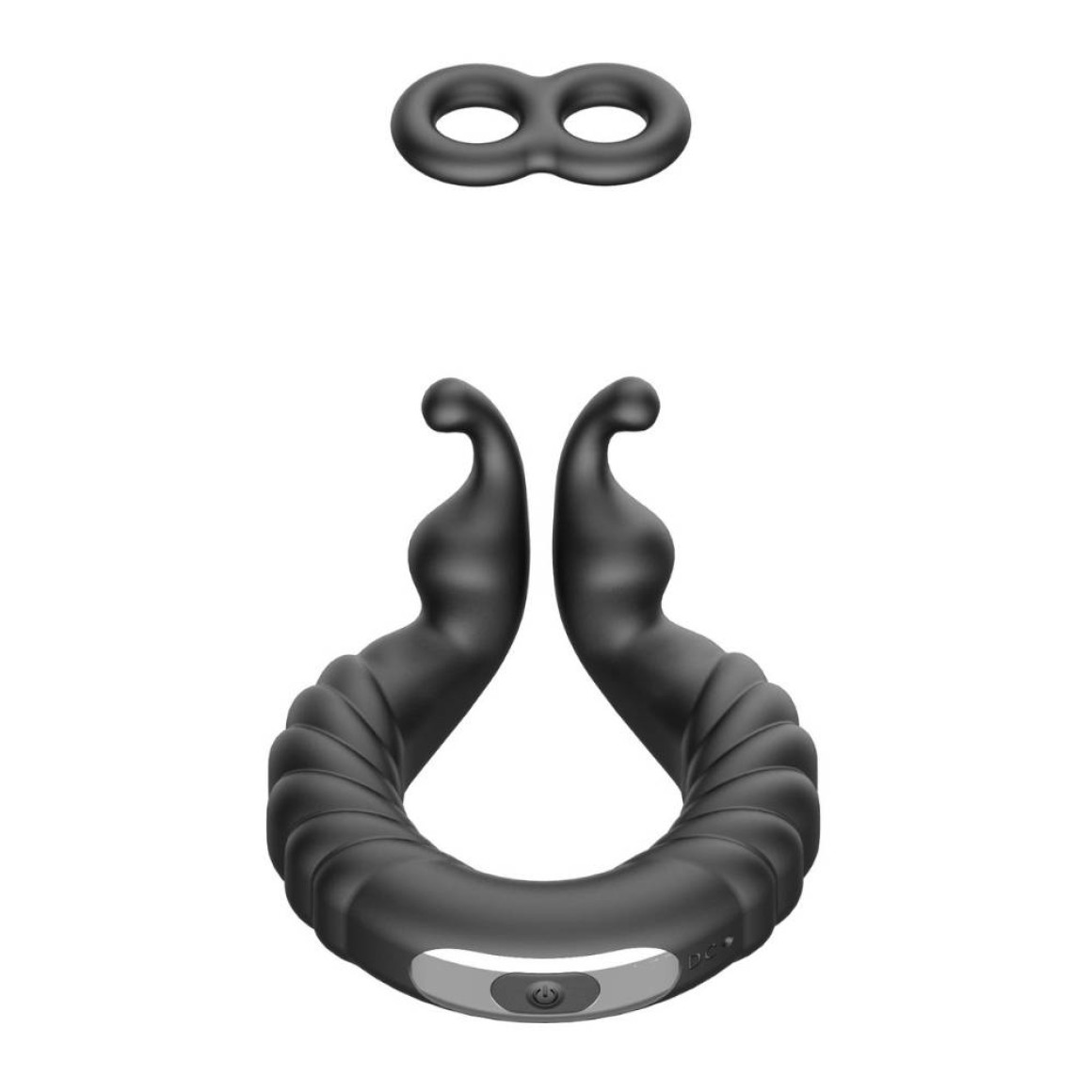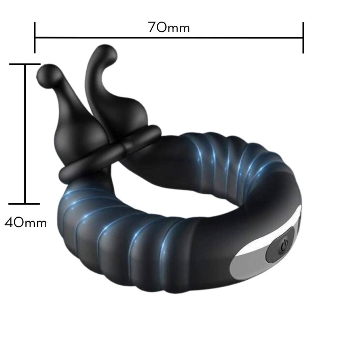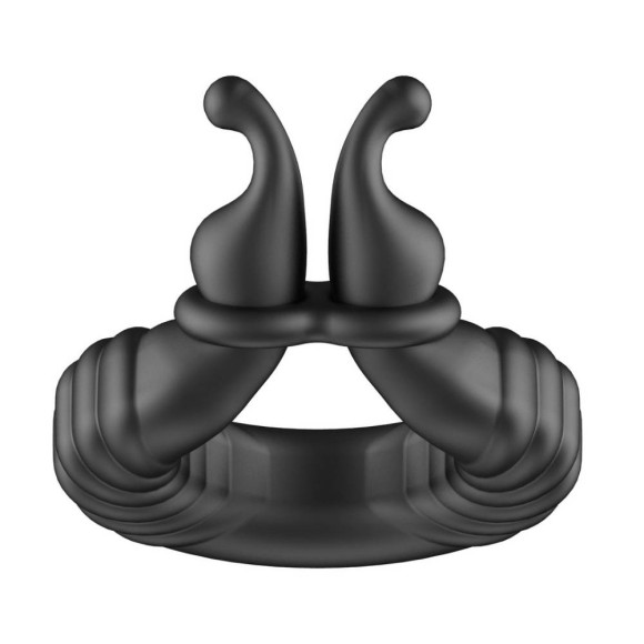 Anel peniano em silicone com vibro e pontas estimuladoras. Possui toque suave, aveludado, detalhes metalizados e relevos estimuladores..