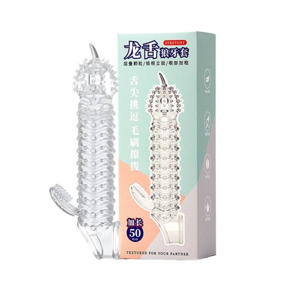 Capa peniana com anel para escroto, saliências em alto relevo e estimulador clitoriano.