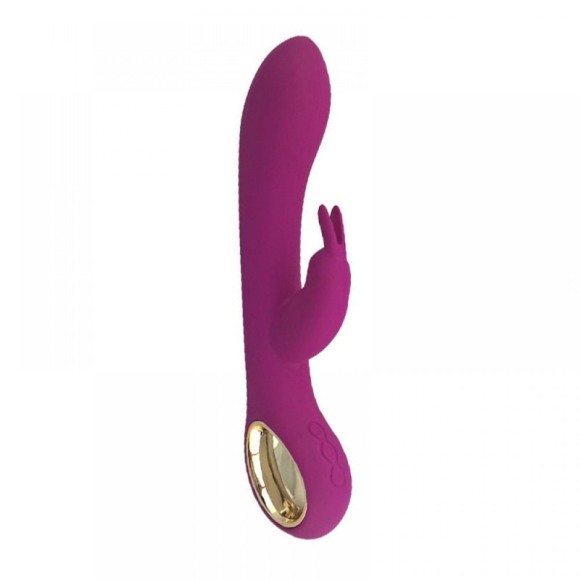 Vibrador ponto G feito de silicone, material macio e com toque aveludado. Possui estimulador clitoriano formato coelho e alça ao final do vibrador que facilita sua remoção após a penetração.