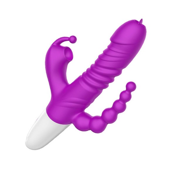Vibrador formato slug com estimulação tripla sendo: Estimulador do ponto G com relevos massageador e estimulador língua mágica com movimentos de vai e vem, estimulador clitoriano formato slug por ondas de pressão e estimulador anal em formato escalonado com vibrações.