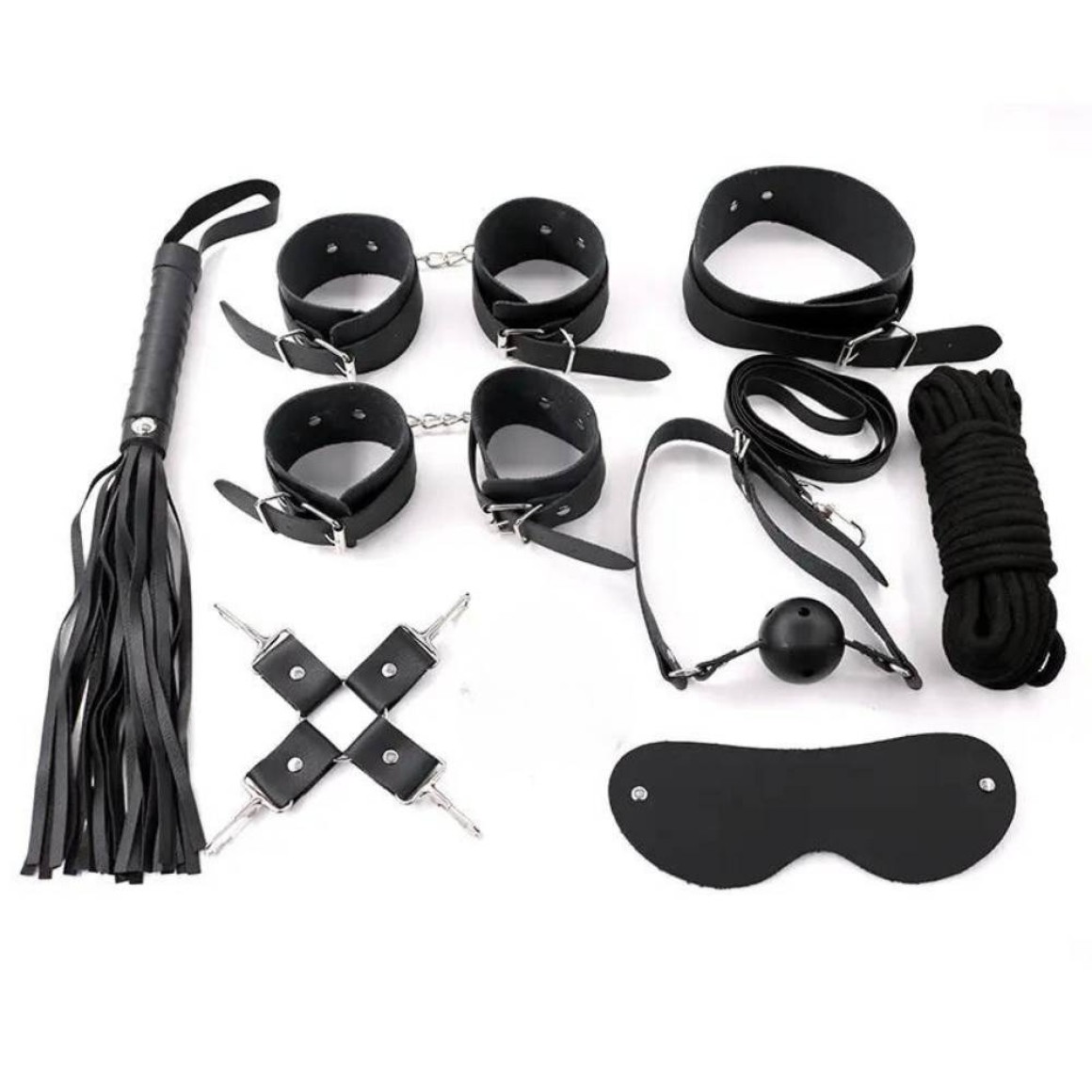 Kit bondage com 8 peças, sendo: Algema, Tornozeleira, Venda, Corda, Coleira e guia revestidas em couro sintético.