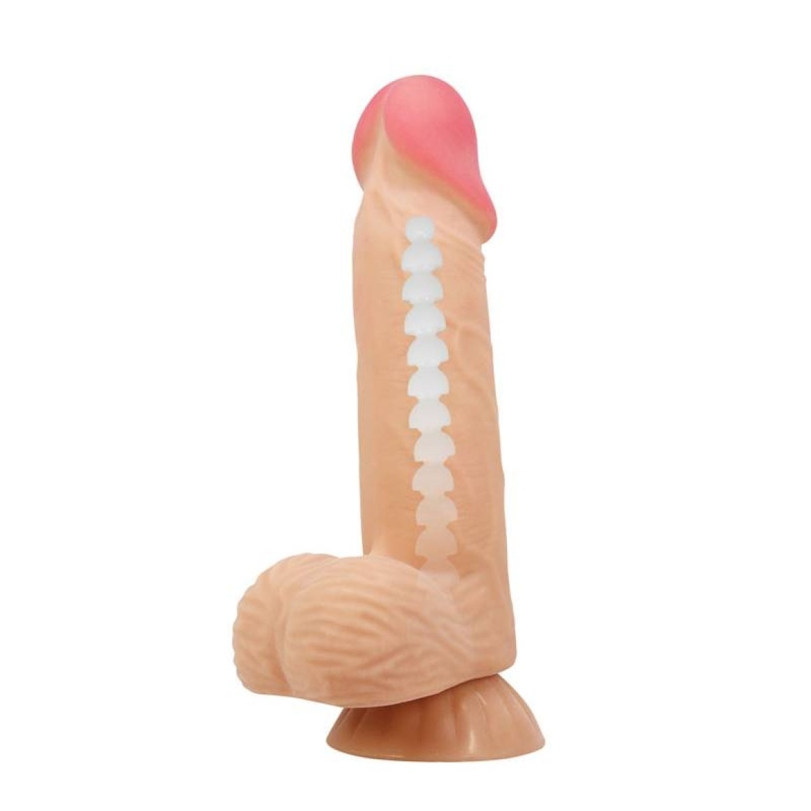 Pênis realístico 21,8 cm, com camada de dupla densidade, possui escroto, veias salientes e ventosa.