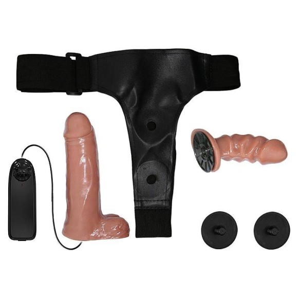 Cinta ajustável com prótese em forma de pênis e estimulador clitóris, que possui vibração multivelocidade e resistência à água.