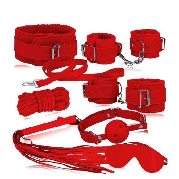 Possui: 1 venda, 1 mordaça, 1 par de algemas, 1 par de tornozeleiras, 1 chicote, 1 coleira com guia, e 1 corda com 5 metros.