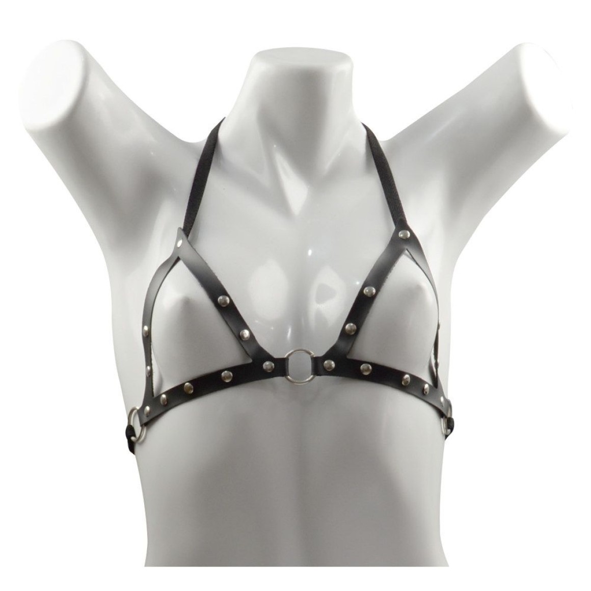 Esse modelo de top é muito sensual, seu formato em triângulo torna a peça muito mais provocante, deixando em destaque os seios. Possui rebites em todo o seu contorno.