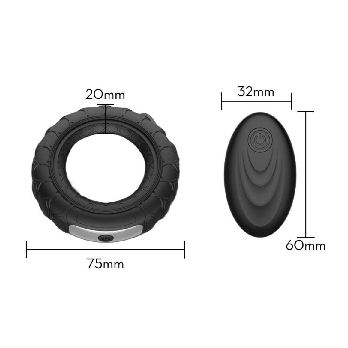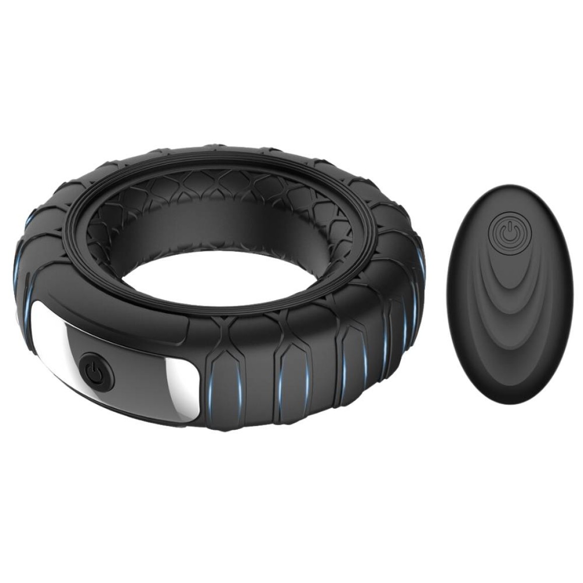 Anel peniano vibratório em formato de pneu com controle remoto. Possui toque suave, aveludado, relevos estimuladores e detalhes metalizados.