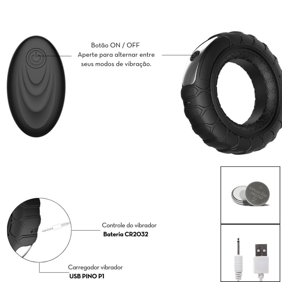 Anel peniano vibratório em formato de pneu com controle remoto. Possui toque suave, aveludado, relevos estimuladores e detalhes metalizados.Bateria: Anel – Recarregável USB (cabo incluso) / Controle: Utiliza 1 bateria CR2032 (inclusa)